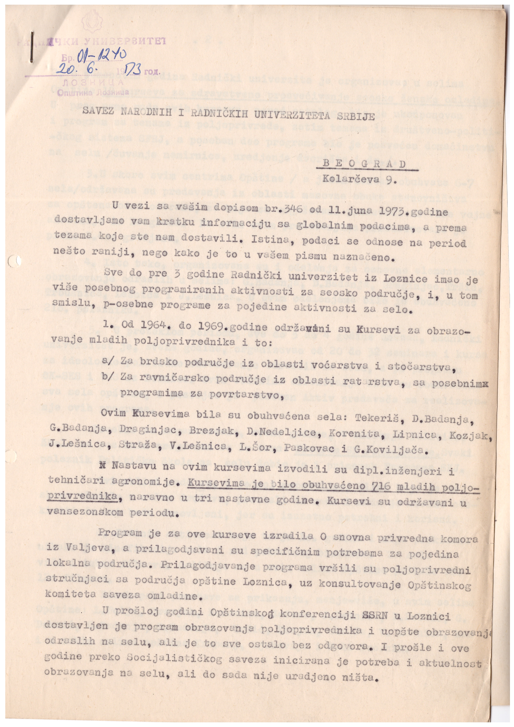 Програмске активности Радничког универзитета биле су веома разноврсне. У периоду од 1964. до 1969. године одржани су курсеви за образовање младих пољопривредника. Теме курсева биле су из области воћарства и сточарства за брдска подручја и из области ратарства и повртарства за равничарска подручја. Обука се изводила у следећим сеоским насељима на територији данашњег Града Лознице: Текериш, Доња Бадања, Горња Бадања, Драгинац, Брезјак, Доње Недељице, Коренита, Липница, Козјак, Јадранска Лешница, Стража, Лешница, Липнички Шор, Пасковац и Горња Ковиљача. Курсеви су се одржавали у вансезонском периоду. Наставу су изводили дипломирани инжењери и техничари агрономије. Циљ наставе је био едукација младих пољопривредника. Наставу је похађало укупно 716 полазника. Програм је био прилагођен специфичним потребама за поједина локална подручја. Наставни програм је израдила Основна привредна комора из Ваљева.