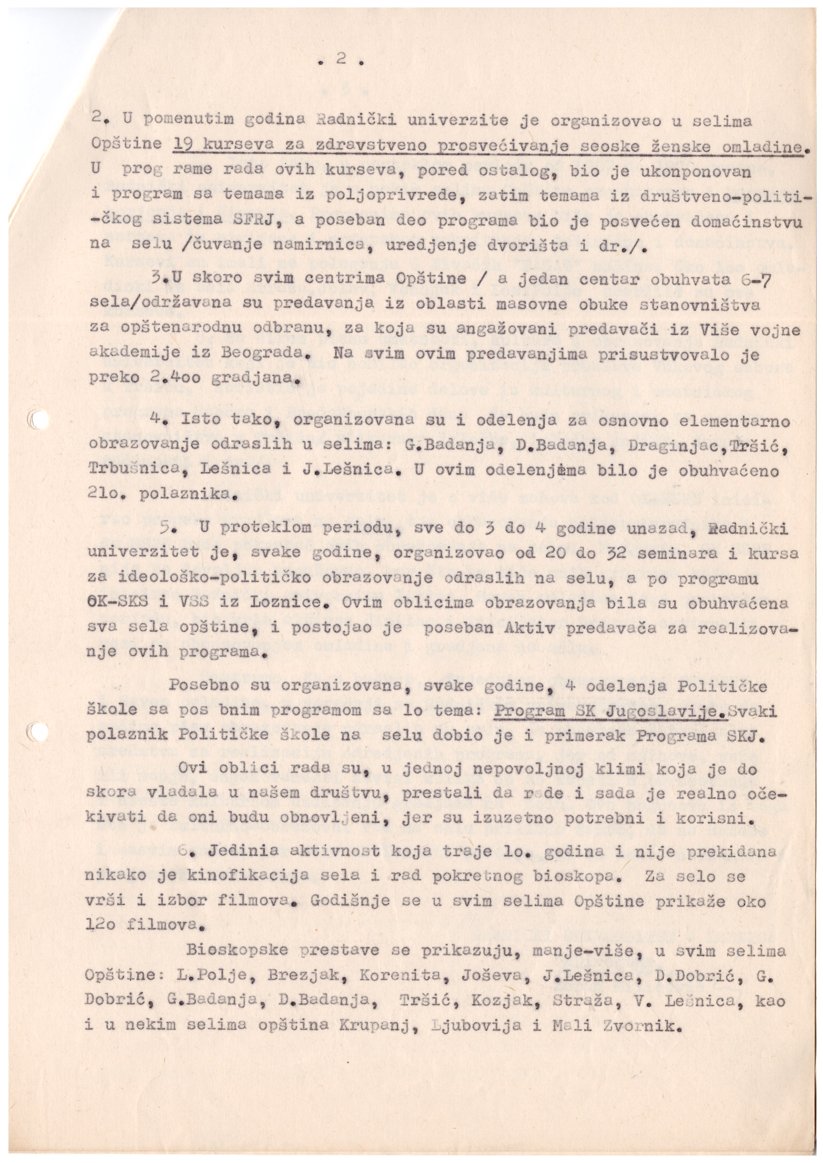 Исто тако, организована су и одељења за основно елементарно образовање одраслих у сеоским насељима: Горња Бадања, Доња Бадања, Драгинац, Тршић, Трбушница, Лешница и Јадранска Лешница. У овим одељењима било је обухваћено 210 полазника.