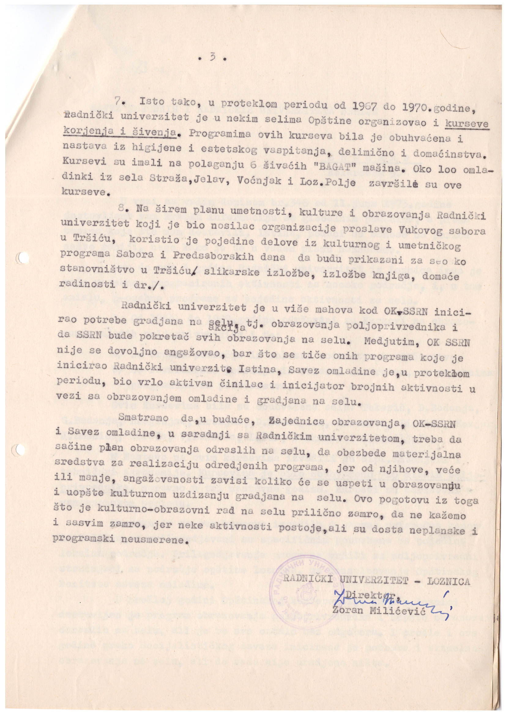 У периоду од 1967. до 1970. године Раднички универзитет је у појединим сеоским насељима организовао курсеве кројења и шивења. Полазнице курса су се обучавале на шест шиваћих „Багат“ машина. Обуку је завршило око 100 полазница из Страже, Јелава, Воћњака и Лозничког Поља.