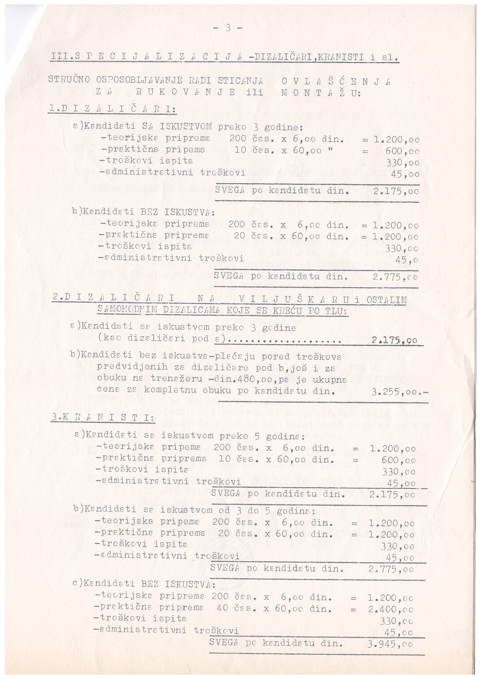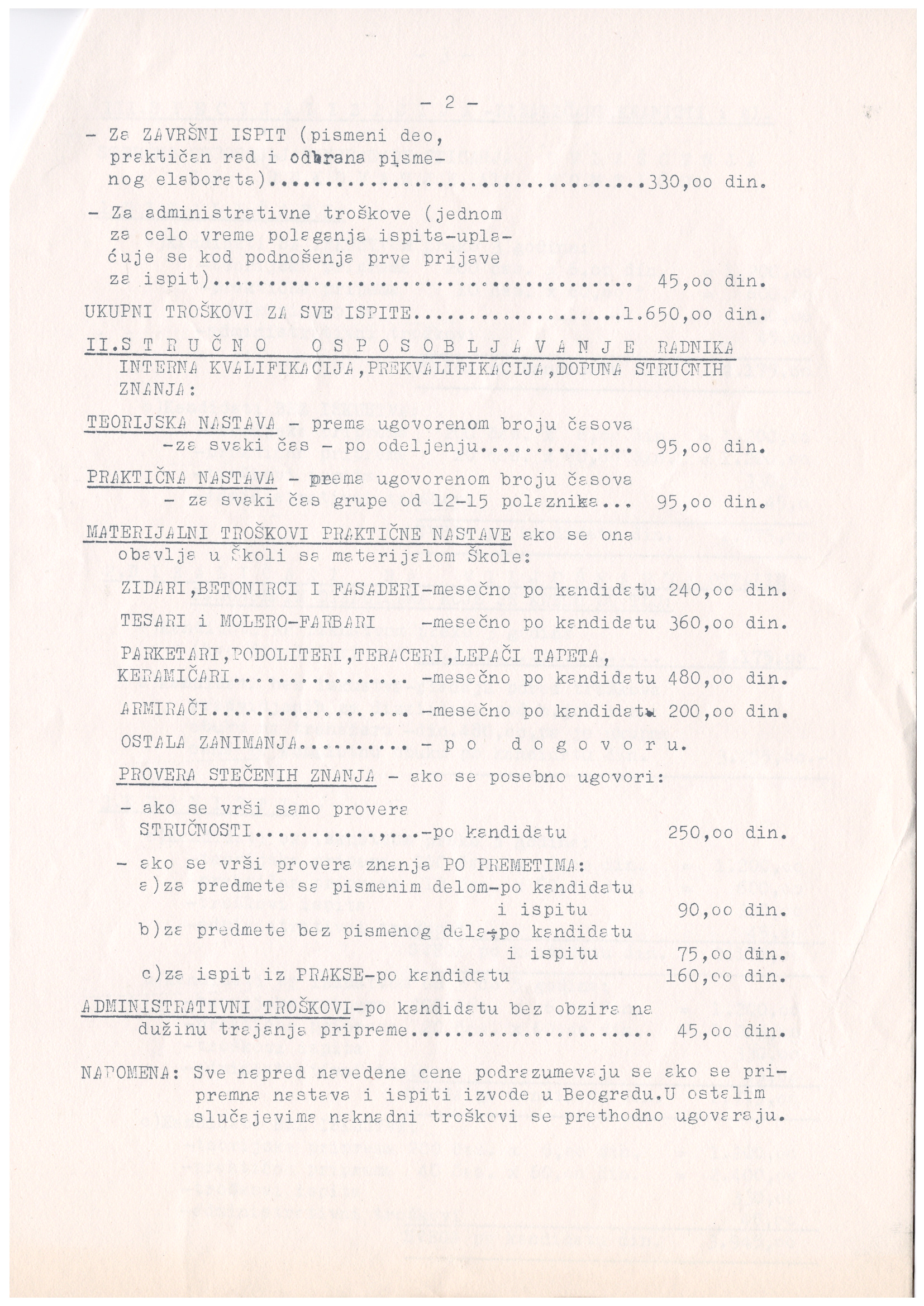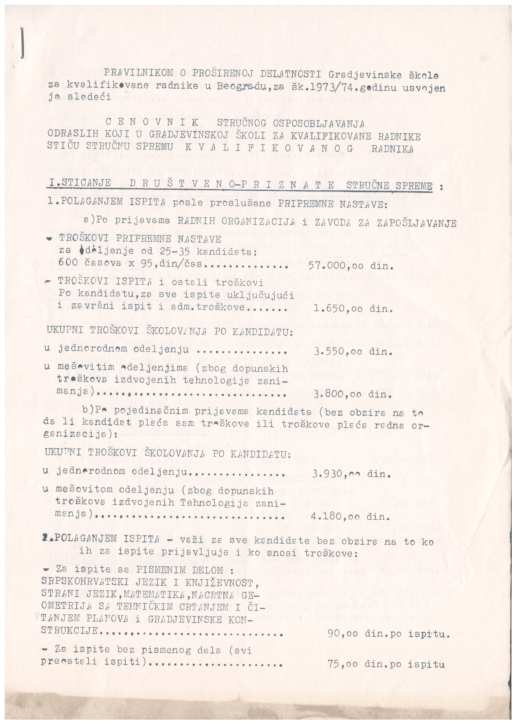 За занимање армирач, I степена стручне спреме, наставу је похађало 25 полазника, док је за занимање тесар, I степена стручне спреме, похађало 75 полазника. Сви полазници су се запослили у СОУР „Хидротехника“ у Београду.