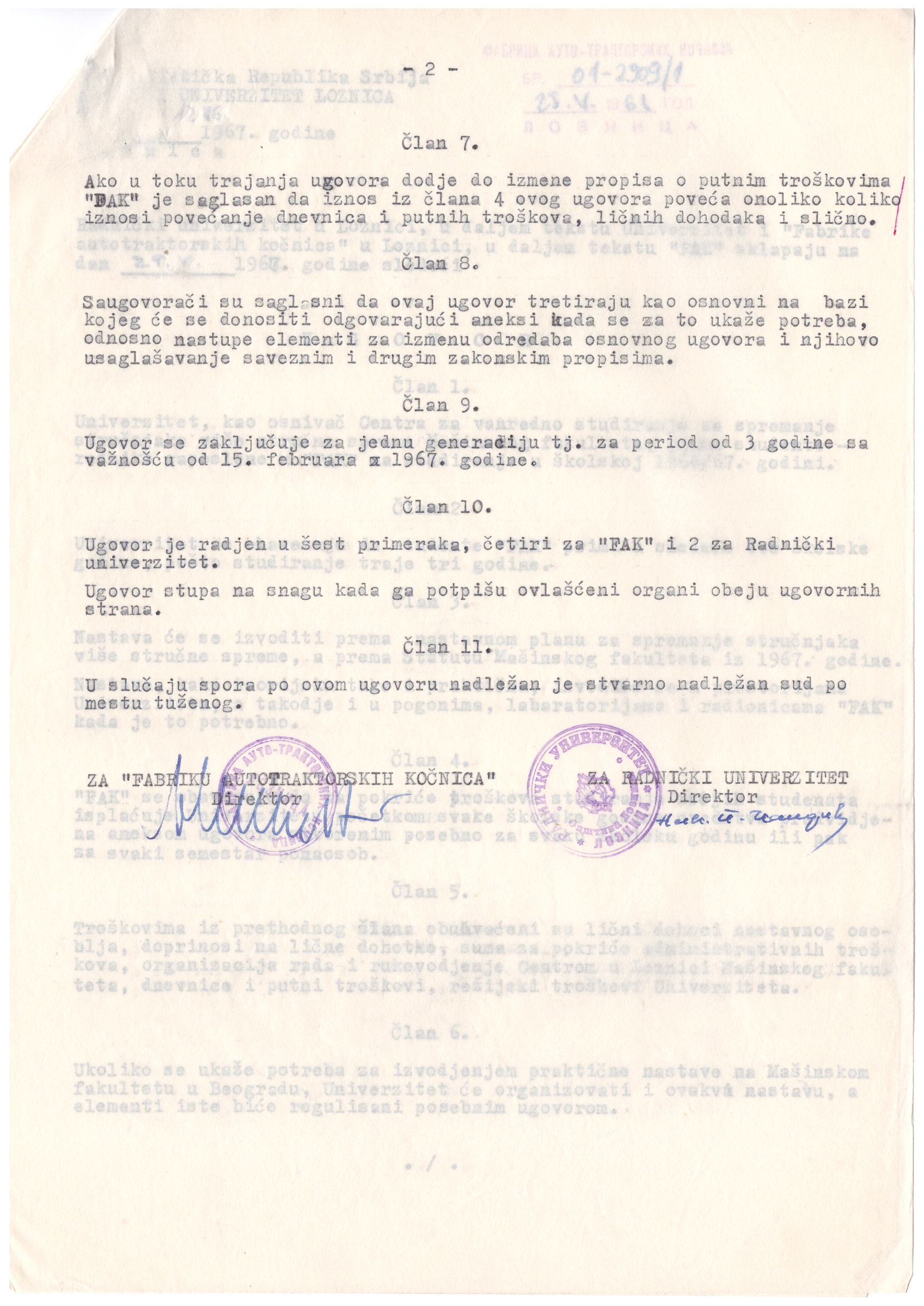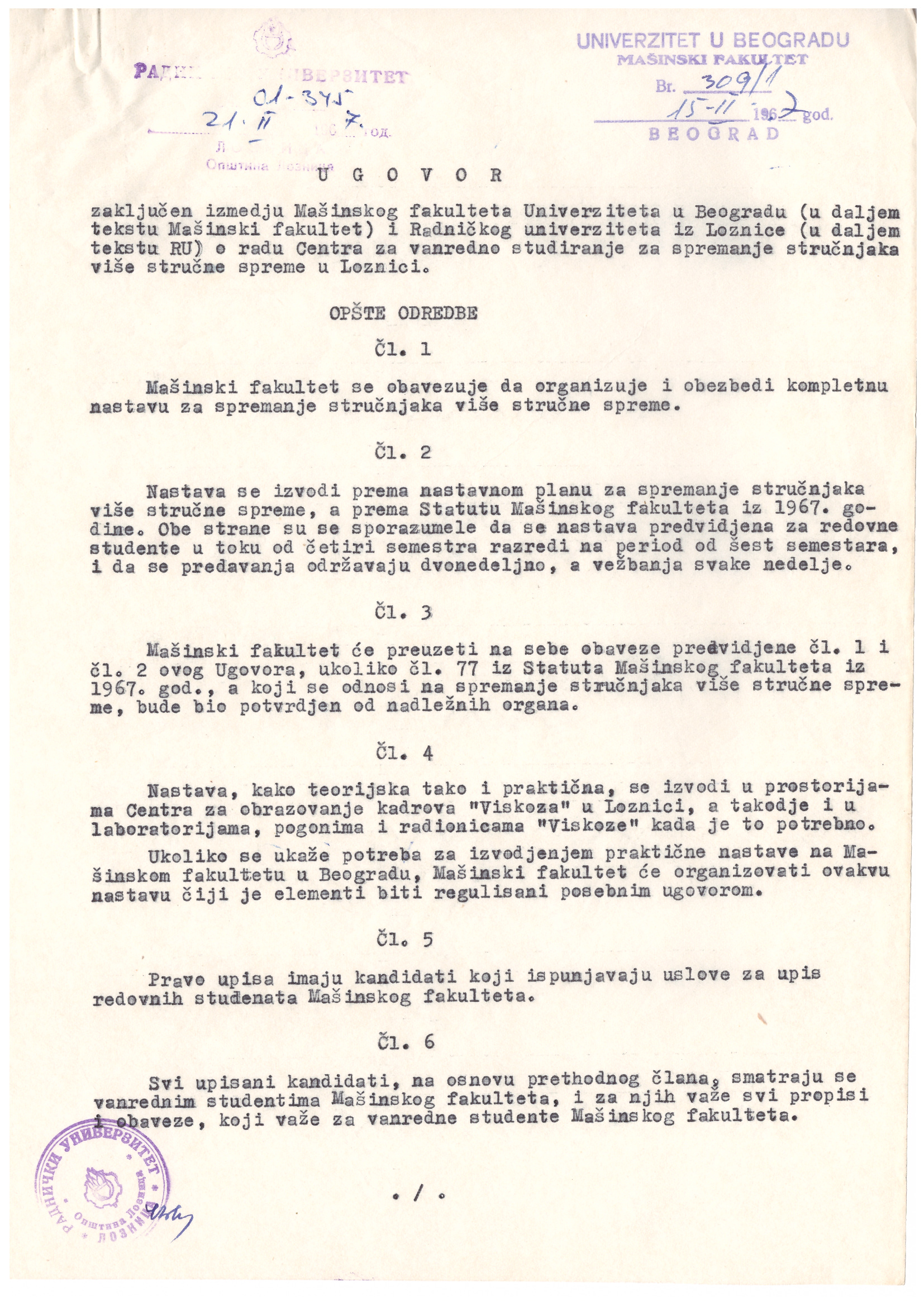 Године 1967. Раднички универзитет је успоставио сарадњу са Машинским факултетом Универзитета у Београду у циљу реализације образовног програма, више стручне спреме. Настава се изводила према Статуту Машинског факултета.