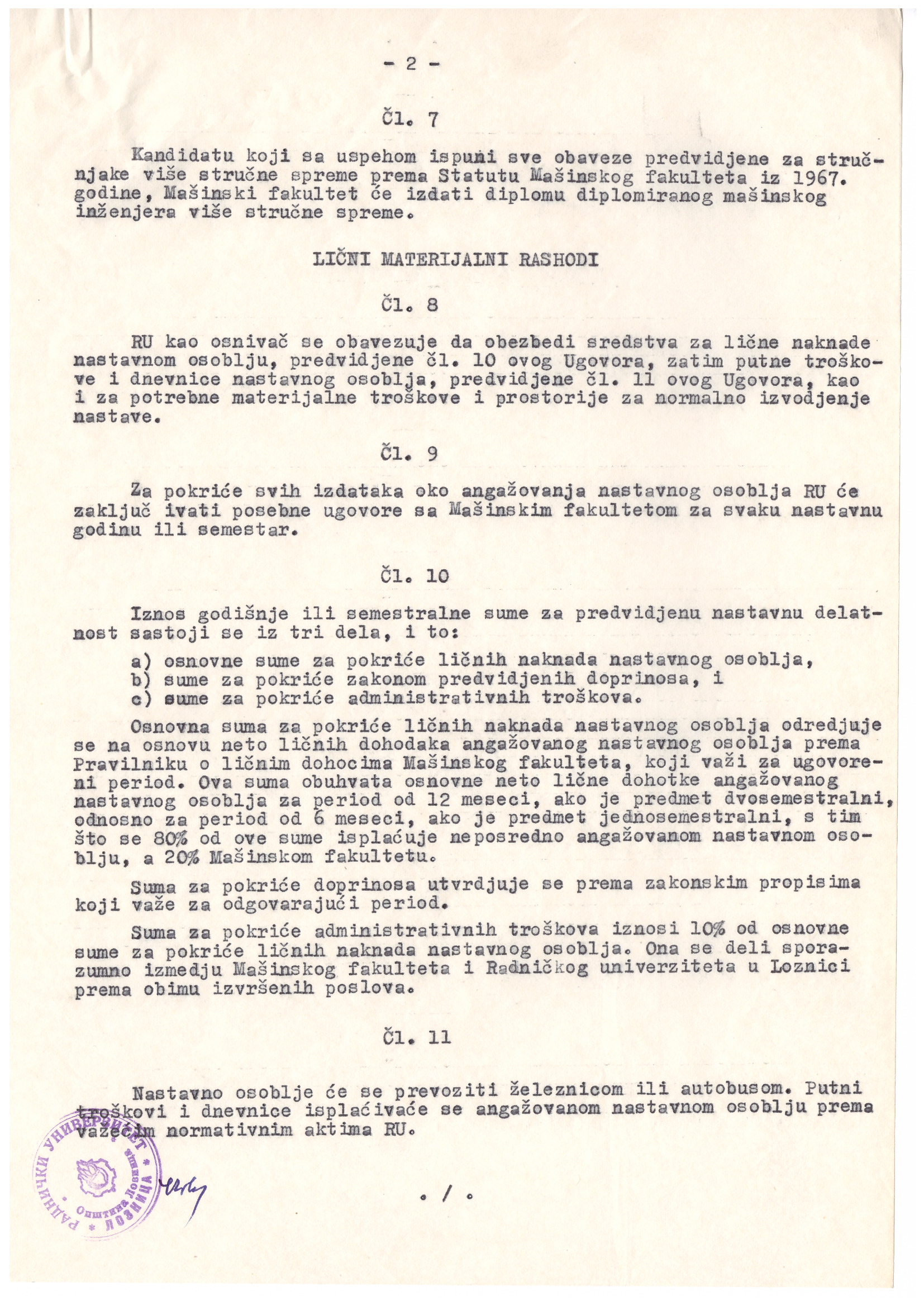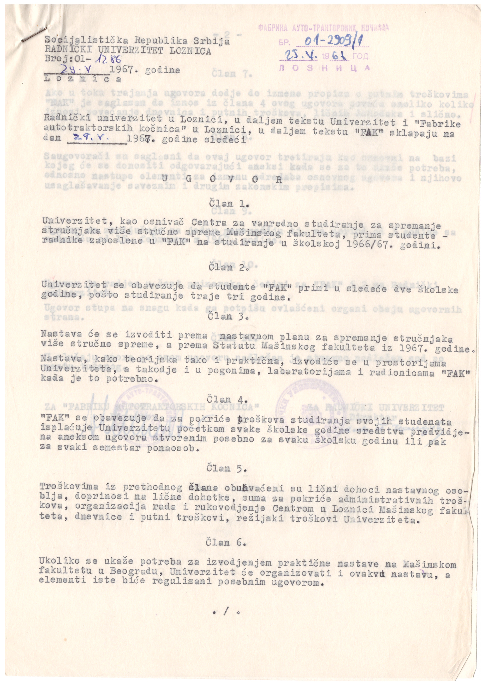 Године 1967. Раднички универзитет је успоставио сарадњу са Машинским факултетом Универзитета у Београду у циљу реализације образовног програма, више стручне спреме. Настава се изводила према Статуту Машинског факултета.