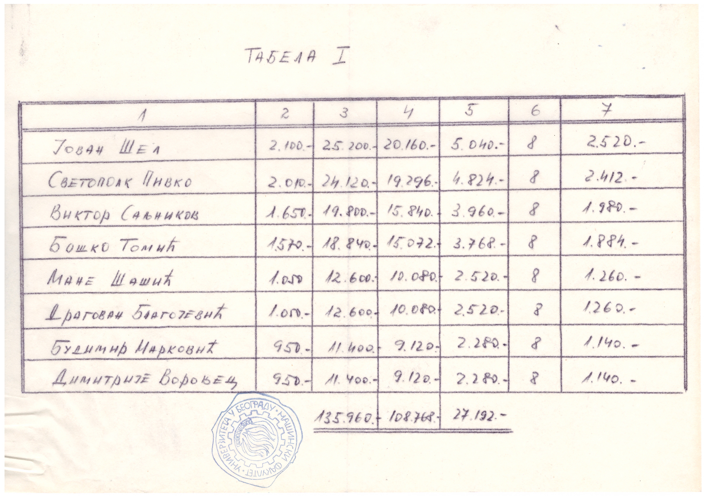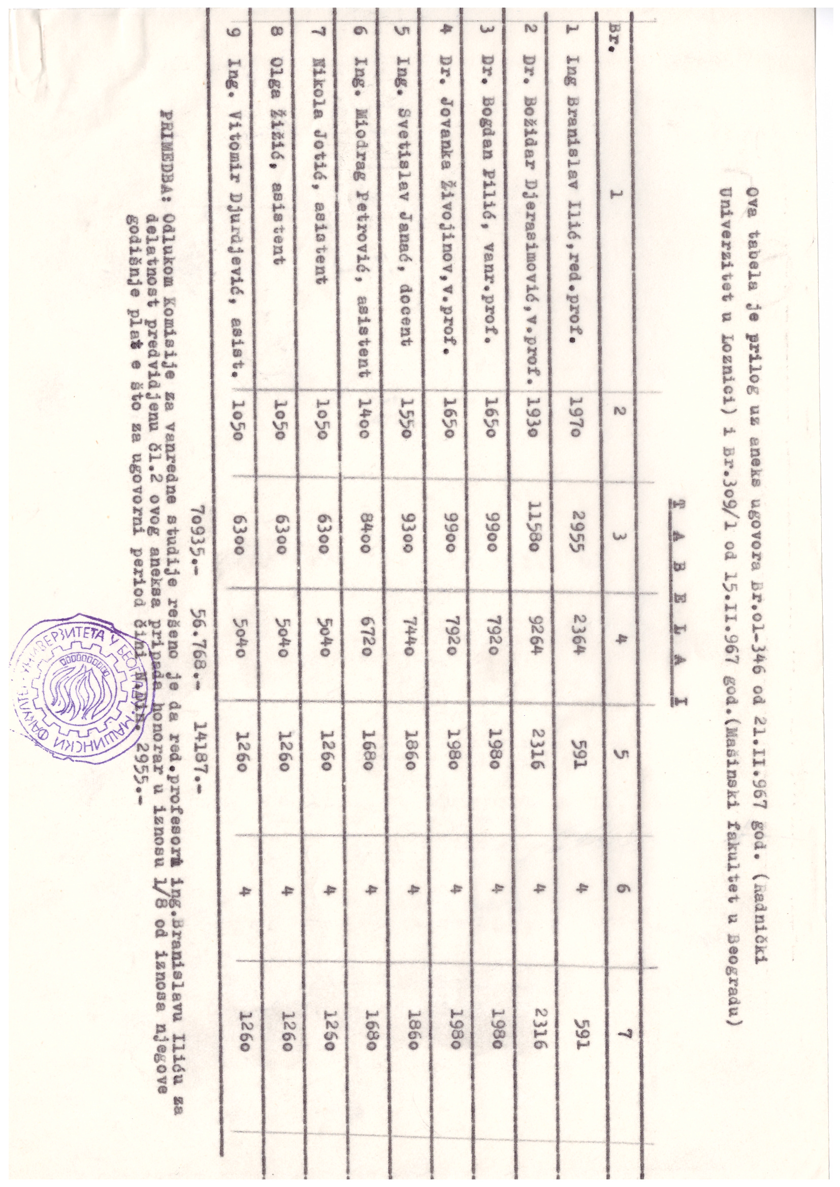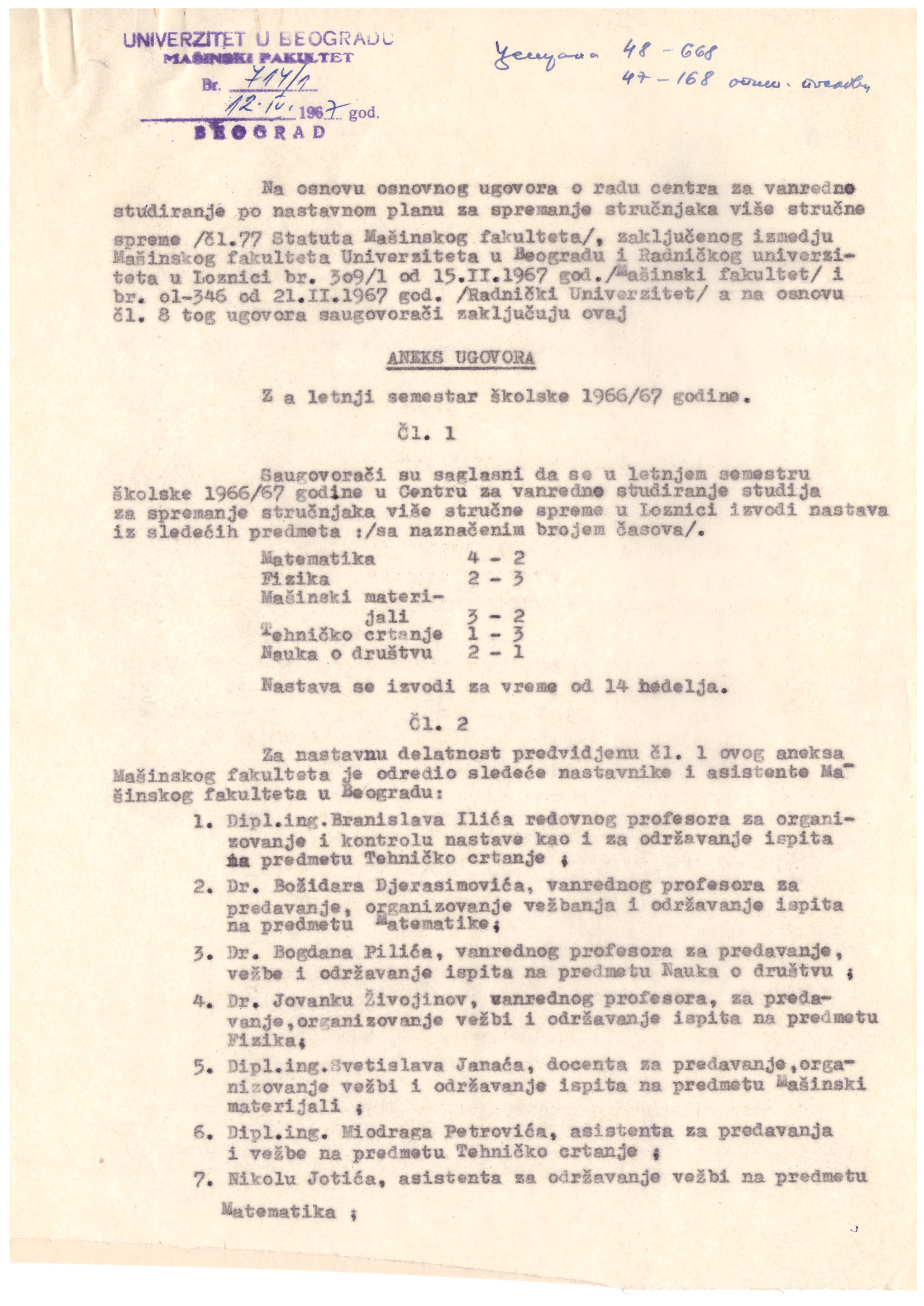 Предавачи су били професори са Машинског факултета (Бранислав Илић, др Божидар Ђерасимовић, др Богдан Пилић, др Јованка Живојинов, Светислав Јанаћ, Миодраг Петровић, Никола Јотић, Олга Жижић, Витомир Ђорђевић, Душан Витас, Јован Шеле, Милан Недић, Драгутин Поповић, Вуксан Булат, Саво Дедијер, Владета Маринковић, Александар Стефановић и Јово Вугделија).